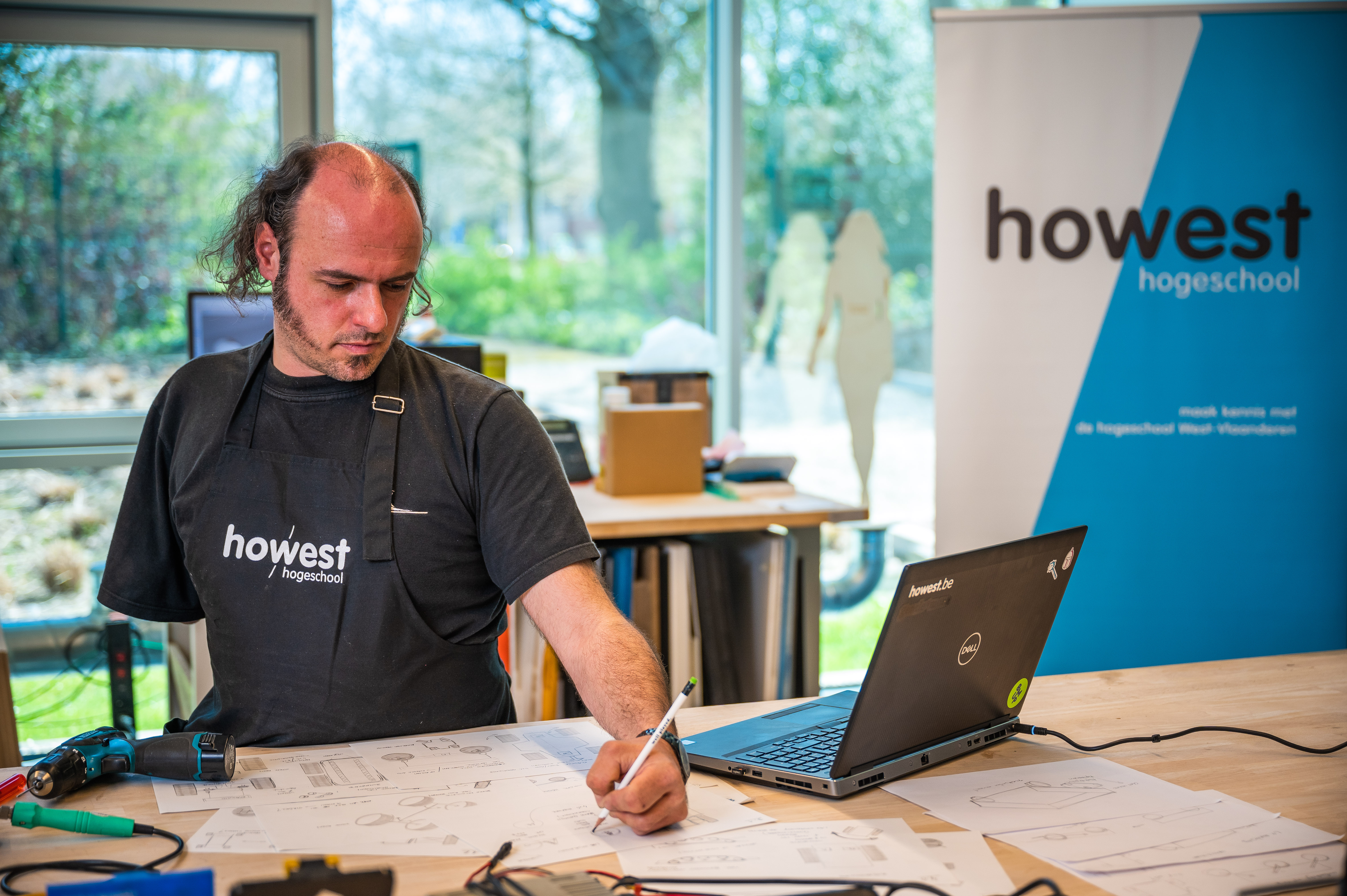 Bart Grimonprez is Project Engineer bij de professionele Bacheloropleiding Industrieel ProductOnwerpenaan de Hogeschool West-Vlaanderen (Howest). Gehuisvest in het Industrial Design Center van Howest, wordt beschikt over een uitgebreid uniek machinepark : naast algemene hout-, metaal-, kunststof-, textiel- en keramiekbewerking, vind je er ook uitgebreide digitale infrastructuur zoals 3D-printers, CNC frees- en lasersnijmachines. Hij zegt hierover het volgende: